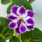 Стандарт. Дуже великі напівмахрові квіти-зірки білого кольору з фіолетово-синім вічком і хвилястим краєм пелюсток. Листочки середньо-зеленого кольору. Розеточка доволі акуратна.