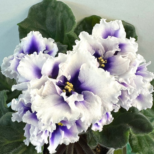 Новинка 2022 року! Махрові, дуже великі, квітки-зірки фіолетово-чорнильного кольору з широкою білою хвилястою каймою. Листочки середньо-зеленого кольору з трохи помітним венозним малюнком.
