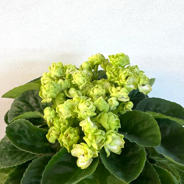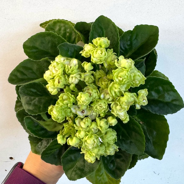 Напівмініатюра. Квіти-качанчики, що тільки в кінці цвітіння розкриваються, біло-зеленого кольору. Квітне довго та дуже рясно. Листочки середньо-зеленого кольору.