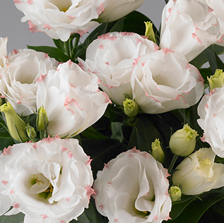 Справжній хіт японської селекції! Компактна, махрова, горщикова еустома, котра стане справжньою прикрасою вдома. Кущ висотою 25-30 см, гарно розгалужений. Квіти діаметром до 8 см, крупні, махрові, ніжно-білого кольору з рожевими мазками на облямівці. Також, підходить і для вирощування у відкритому ґрунті.