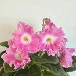 Махровые цветки-розочки нежного персиково-розового цвета. Листья ровные средне-зеленые с кроновой пестролистностью. Миниатюрная трейлерная фиалка.