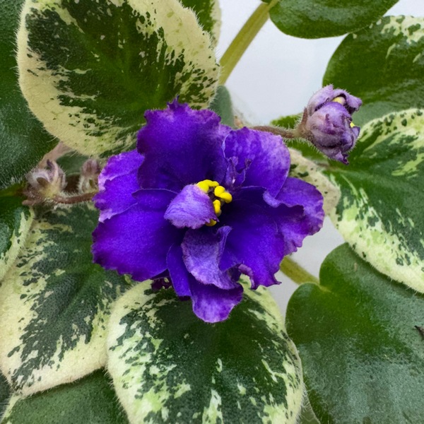 Полуминиатюра. Петролистник. Цветочки фиолетового цвета, большие, махровые. Край лепестков резанный. Листочки темно-зеленого цвета с красивой бело-кремовой пестротой по краю листочка.