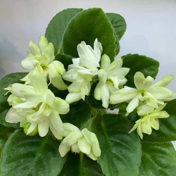 Полуминиатюра получила свое название из-за формы цветочков. Цветы по форме напоминают цветок георгина. Густо махровые, белого цвета с голубыми редкими полосками и зеленой каймой. Цветет сильно и долго. Розетка ровная, компактная, листья со слегка заостренными зубчиками. В коллекциях встречаются интересные спорты, когда на розетке одновременно расцветают и белые и голубые цветы.