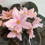 Простые розовые звезды с лавандово-голубыми полосками Темно-зеленая листва, в форме сердца с красной изнанкой. Стандарт.
