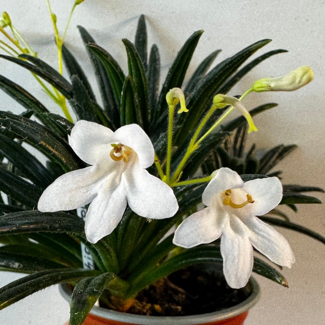 Новинка в колекції! Дуже цікавий сорт примуліни. Характер росту схожий на пальму. Листочки темно-зеленого кольору, дуже м’ясисті та щільні. По краю листочка є невеликі шипи. Квітки класичної форми, невеликі, білого кольору. На квітоносі формується до 5 квіточок.