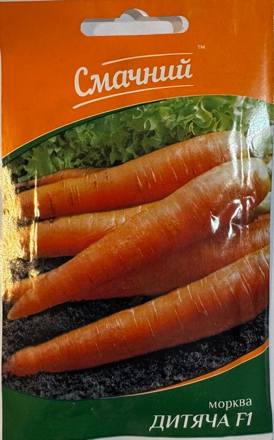 Середньо стиглий сорт дуже солодкої та смачної моркви. Дуже гарно зберігається і довго лежить. Коренеплід масою 150-200 грам, довжиною 18-20 см, діаметром до 3 см, червоно-помаранчевого кольору, мʼякоть дуже солодка, хрустка та соковита. Сорт моркви Дитяча має дуже високий вміст каротину та поживних речовин. Використовується для споживання в свіжому вигляді та різних варіантів переробки.